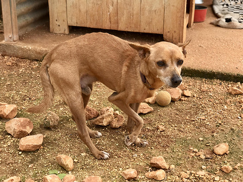A minha história de vida: em fevereiro de 2025 fui encontrado por voluntários da cadela Carlota que estavam a fazer uma caminhada em Monchique. Encontraram-me no meio do nada, muito magrinho, cheio de pulgas e um pouco receoso. Tinha também uma para torta e eles levaram-me ao veterinário, para ser observado. No veterinário deram-me um desparasitante mas, como não havia nada a fazer em relação à pata, levaram-me para o abrigo.