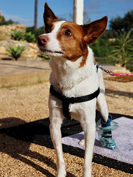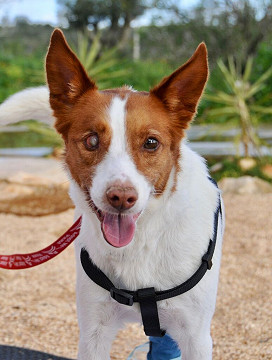 A minha história de vida: fui viver para o abrigo em dezembro de 2024. Vivia numa quinta, numa corrente. Quando o meu dono morreu eu conheci a filha dele. Ela não sabia que o pai tinha um cão e ficou muito espantada quando me viu na corrente, muito magro, com uma ferida na pata e cego de um olho. Decidiu que não me podia deixar ali, senão eu morria, mas também não podia ficar comigo, pois a sua casa era muito pequena. Assim, resolveu pedir ajuda na Cadela Carlota.